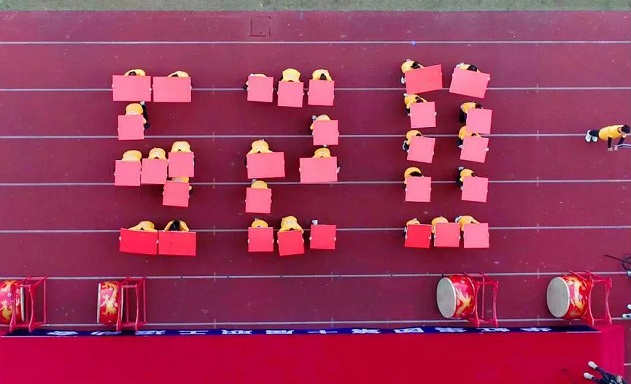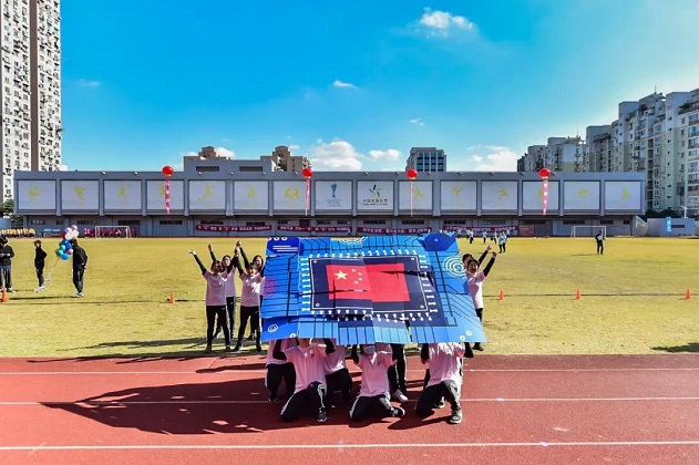 此時(shí)綠茵場(chǎng)上,方陣隊(duì)伍列隊(duì)完畢,操場(chǎng)上擺出巨型芯片造型,動(dòng)作整齊劃一,場(chǎng)面生動(dòng)震撼。
